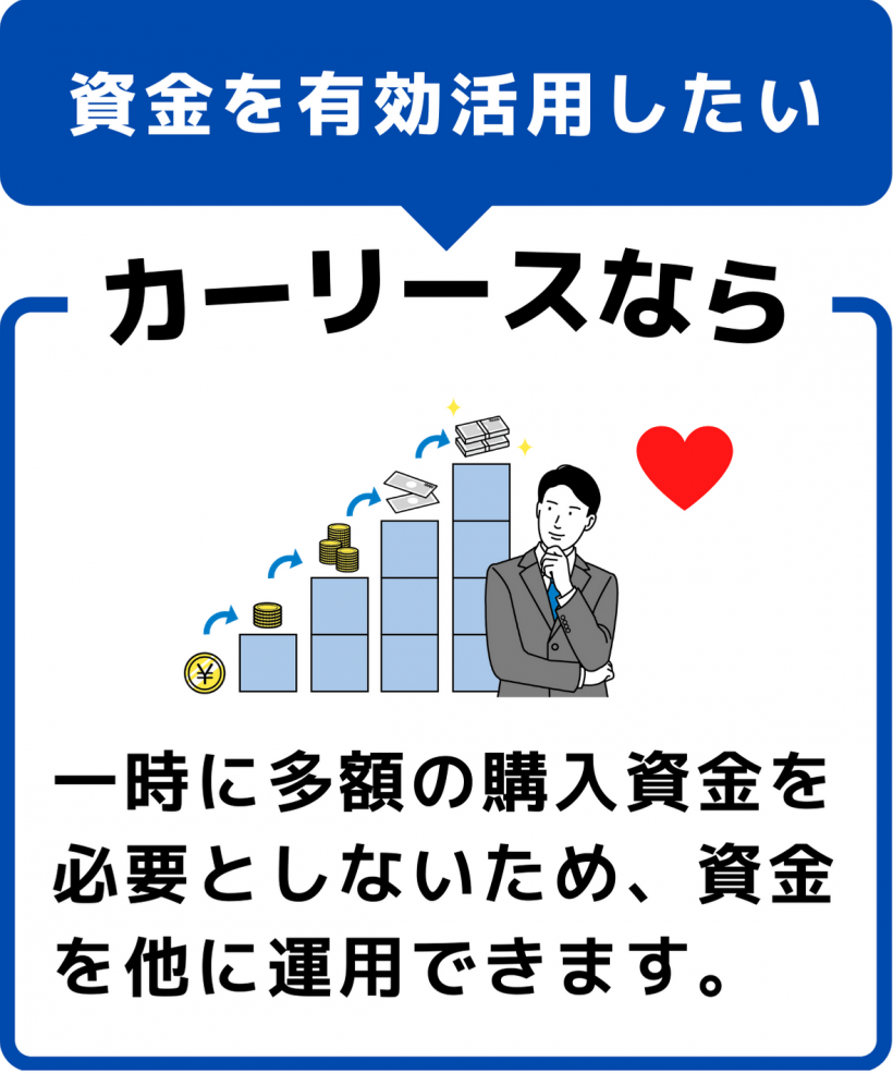 クルマの購入には、一時的に多額の資金が必要になりますが、リースでは毎月のリース料の支払いのみでクルマに乗る事が出来ます。