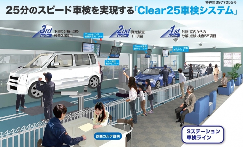独自の車検検査システム(特許取得)を利用して、1台の車を3名の国家資格整備士チームで実施することにより、105項目の車検検査を25分という驚きのスピードで実現しました。